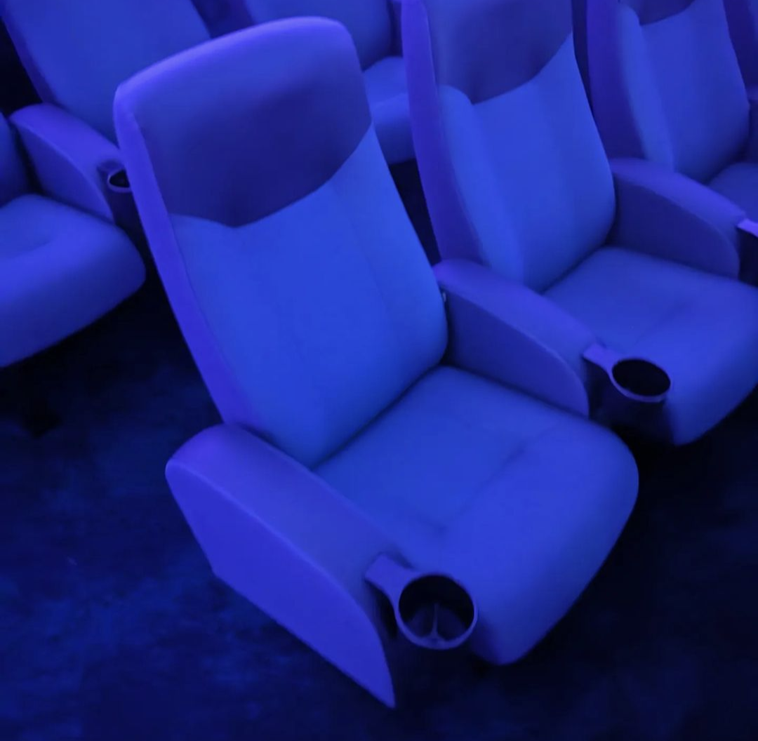 - Theatre seats are 20″x20″ with short/low armrests and reclining seat backs
