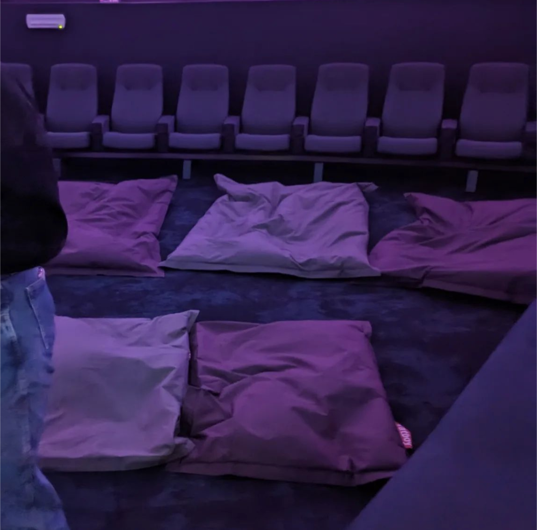 - Several large open soft-seating areas (beanbags available), but area is on a slight slope towards stage