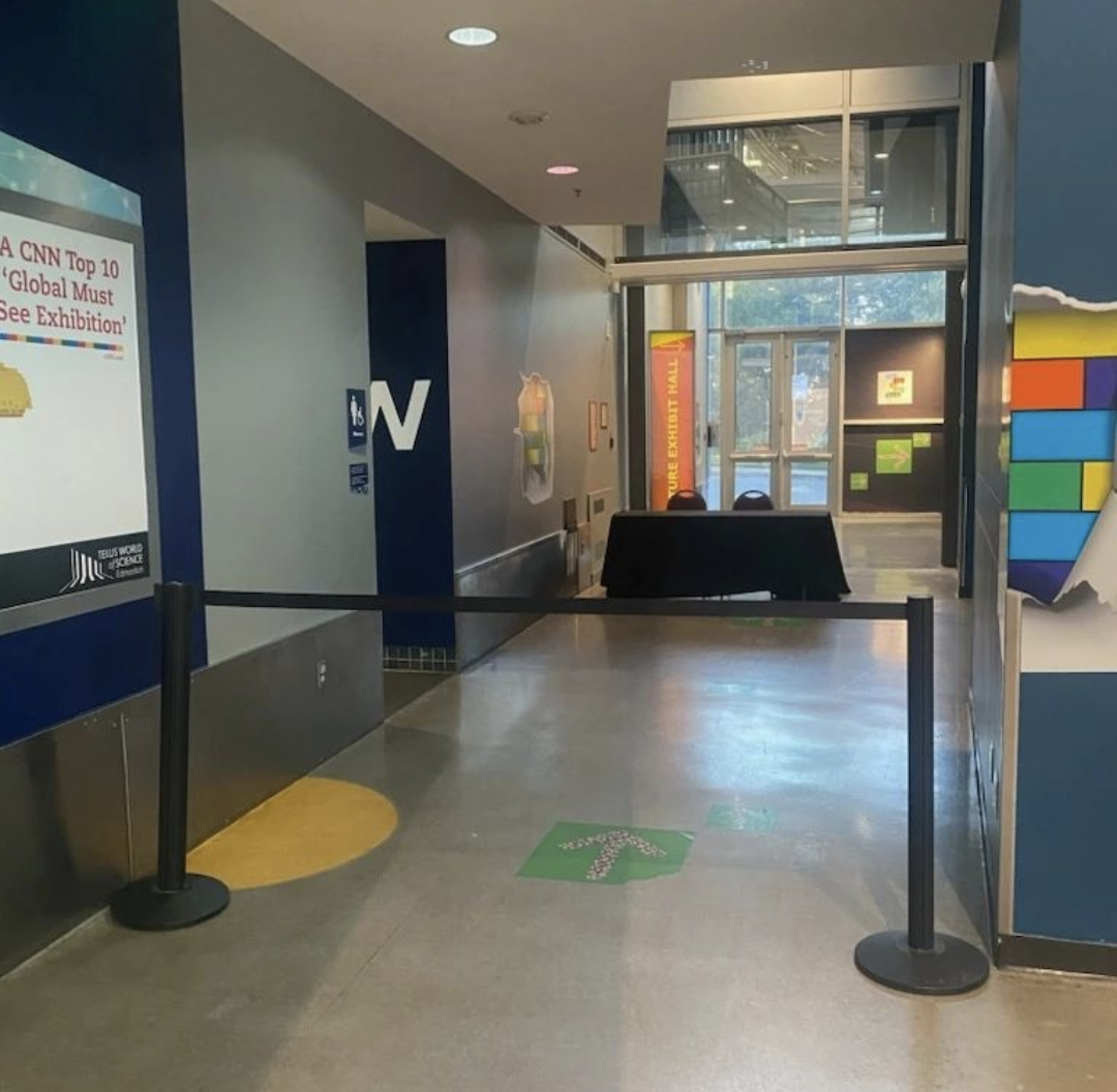 - Info was taken during a private event held after usual Telus World of Science hours of operation, and the hall to the bathrooms had been roped off. The secondary bathroom entrance was crowded with chairs and equipment (see photos).