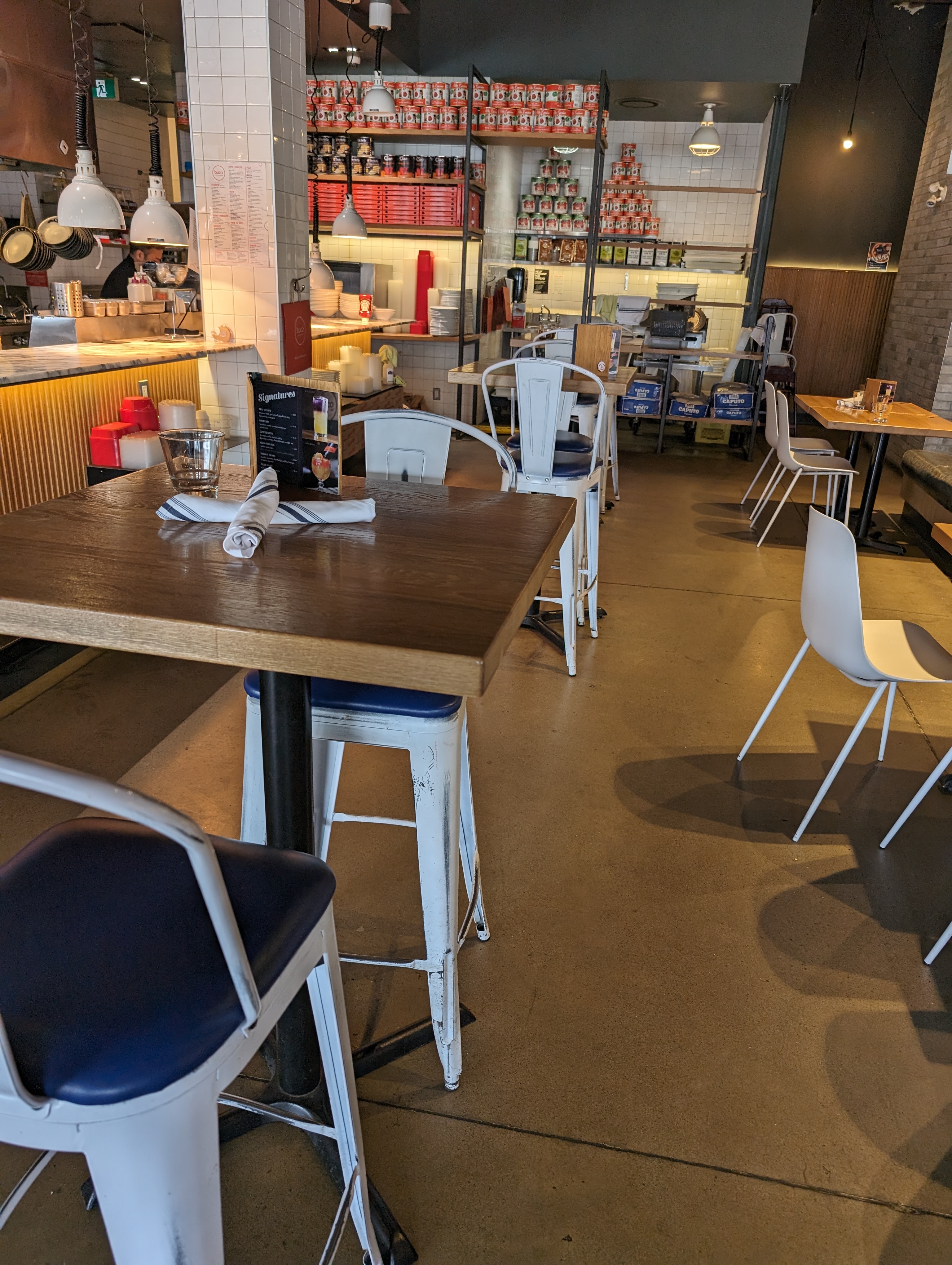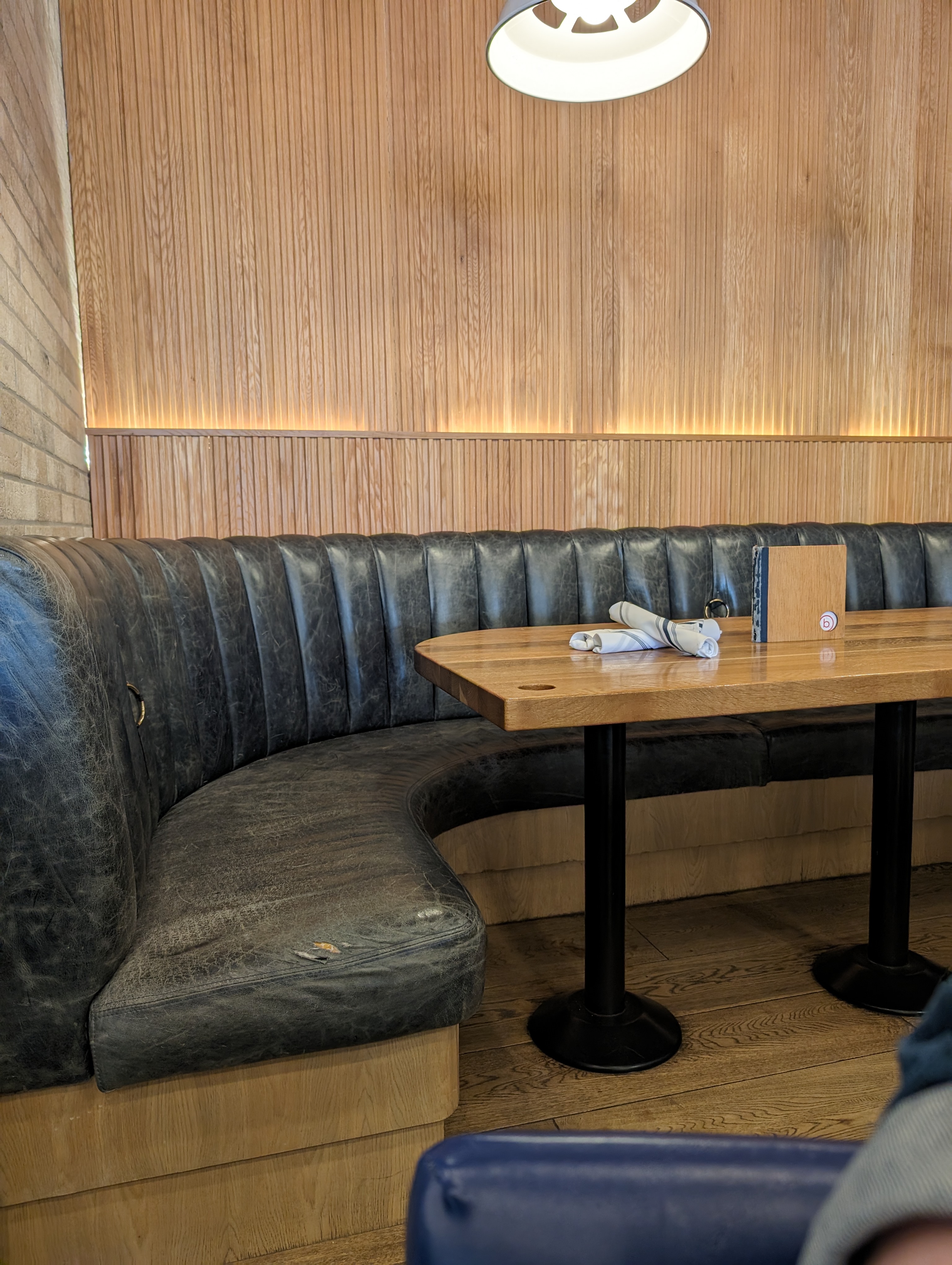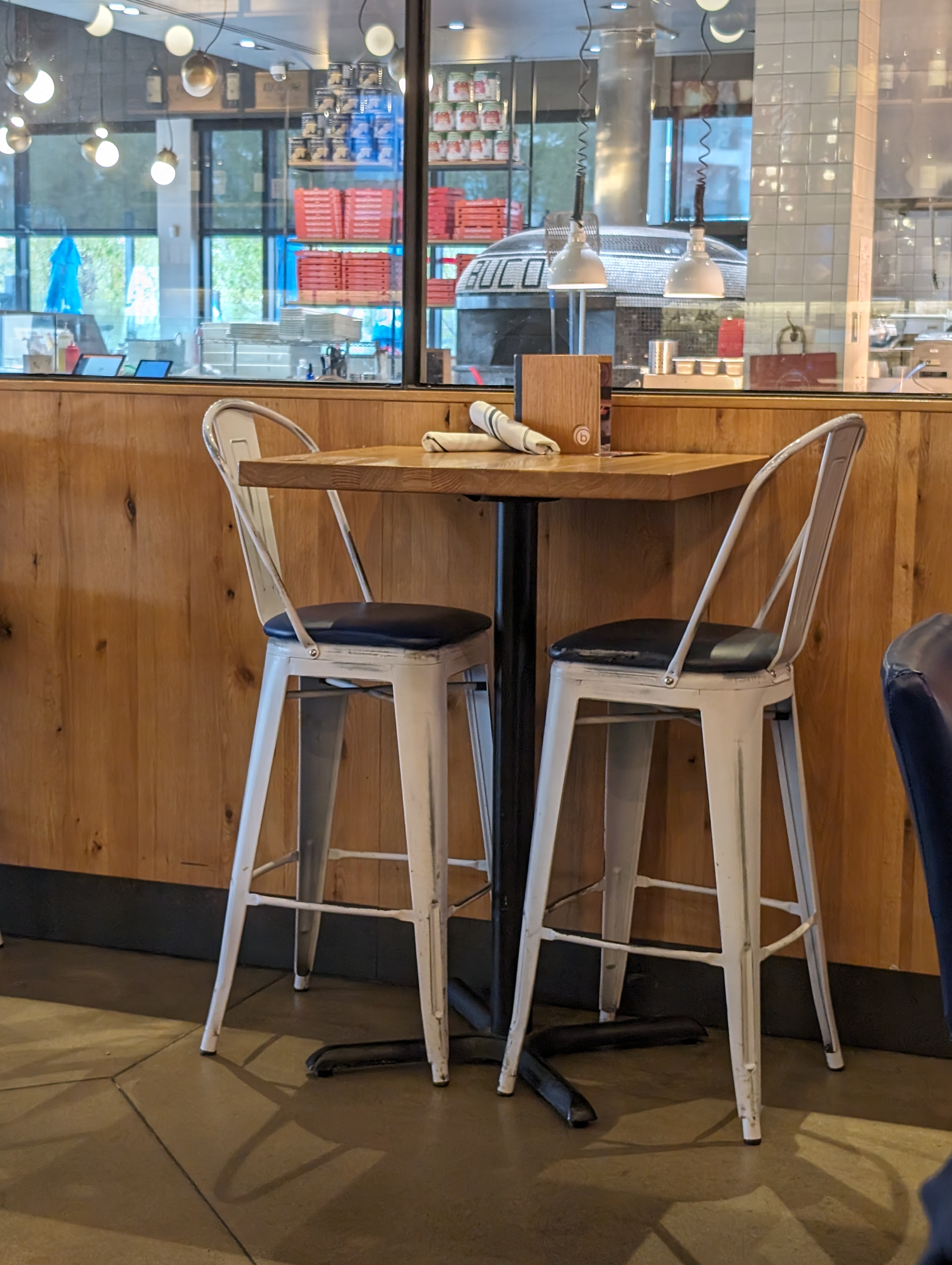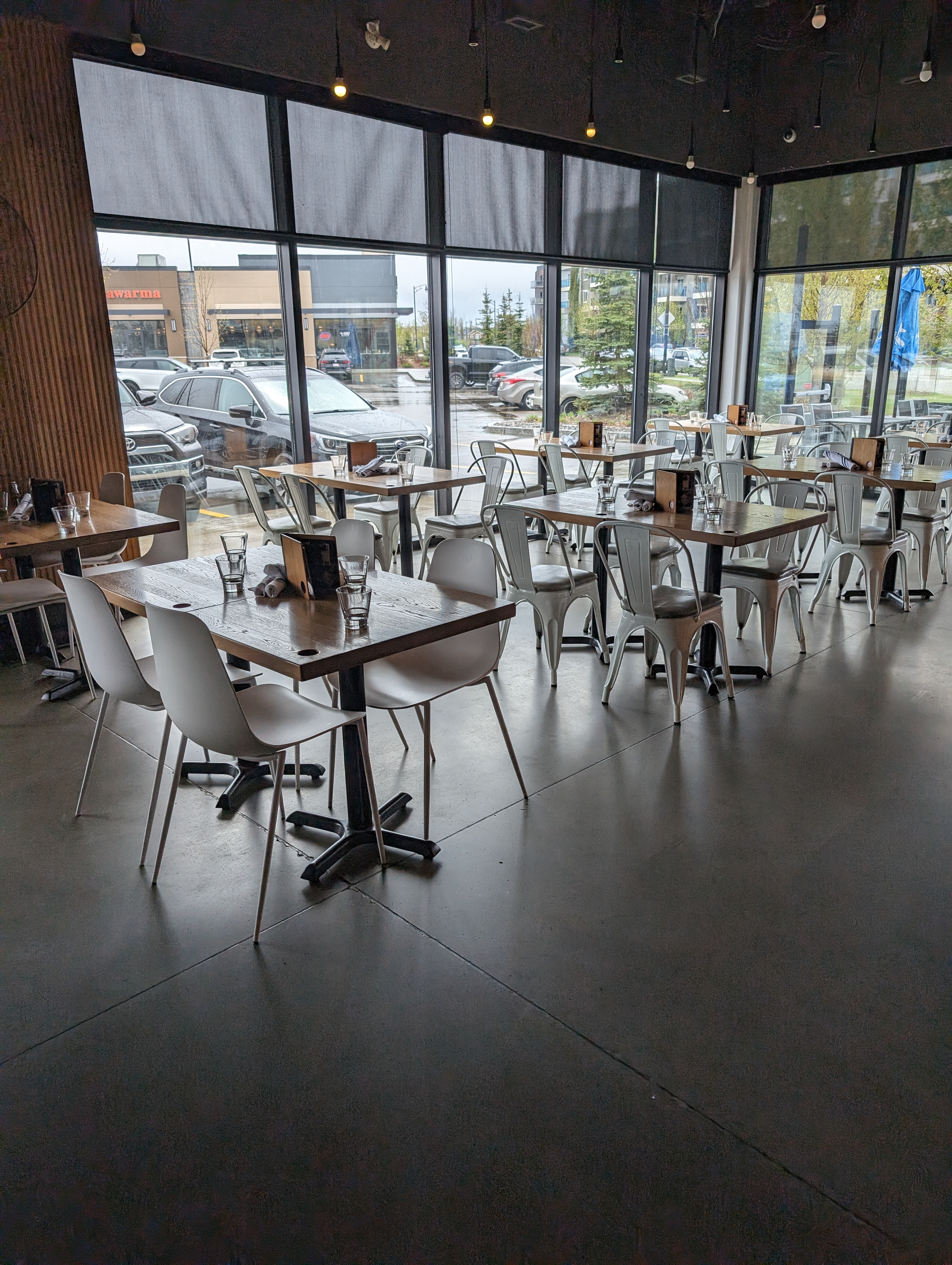 - Varied seating, including raised/bar-level chairs and booth, and floor-level chairs and booths