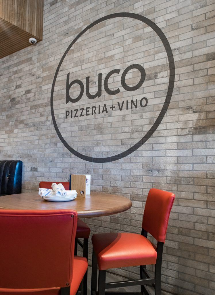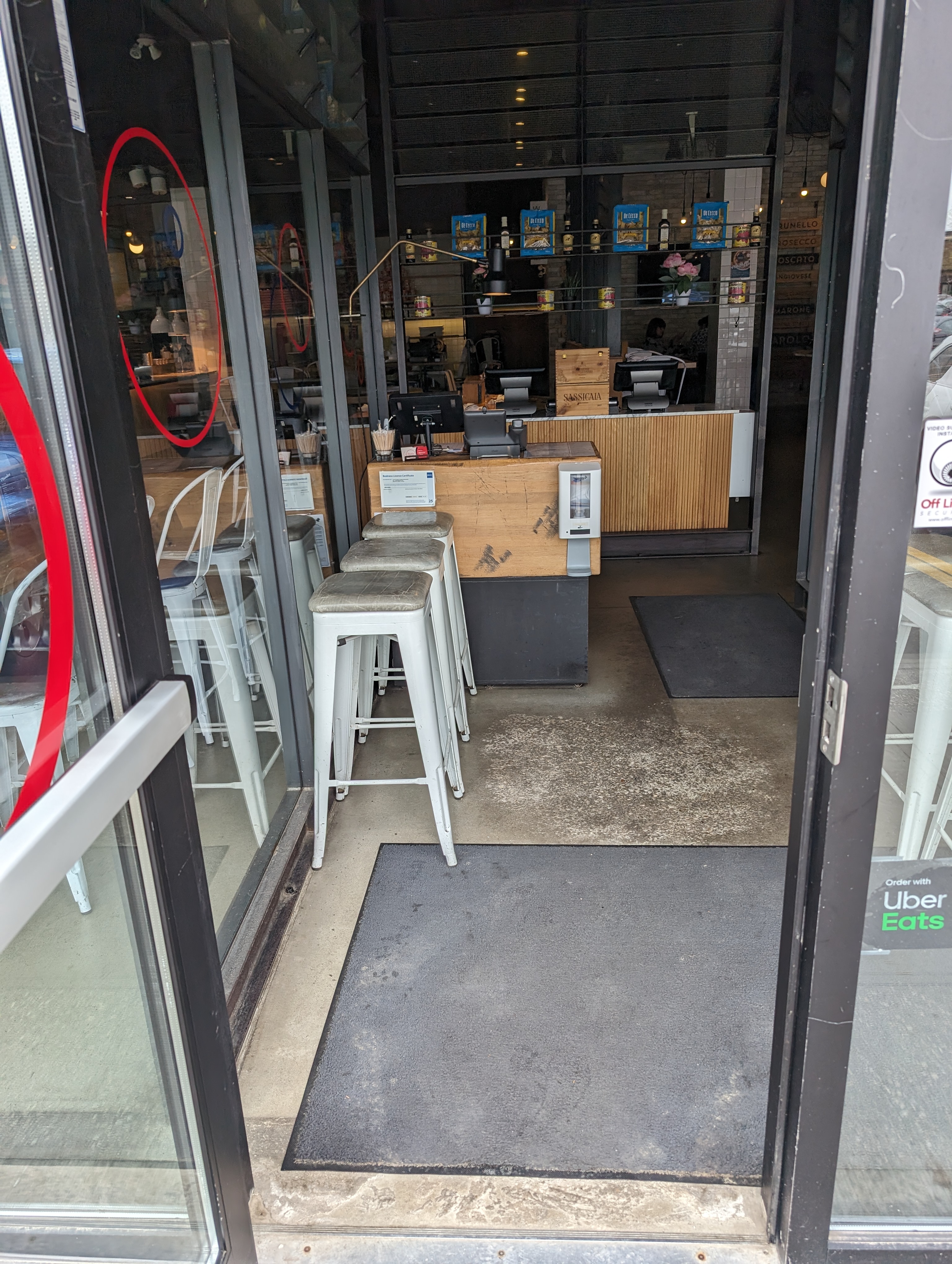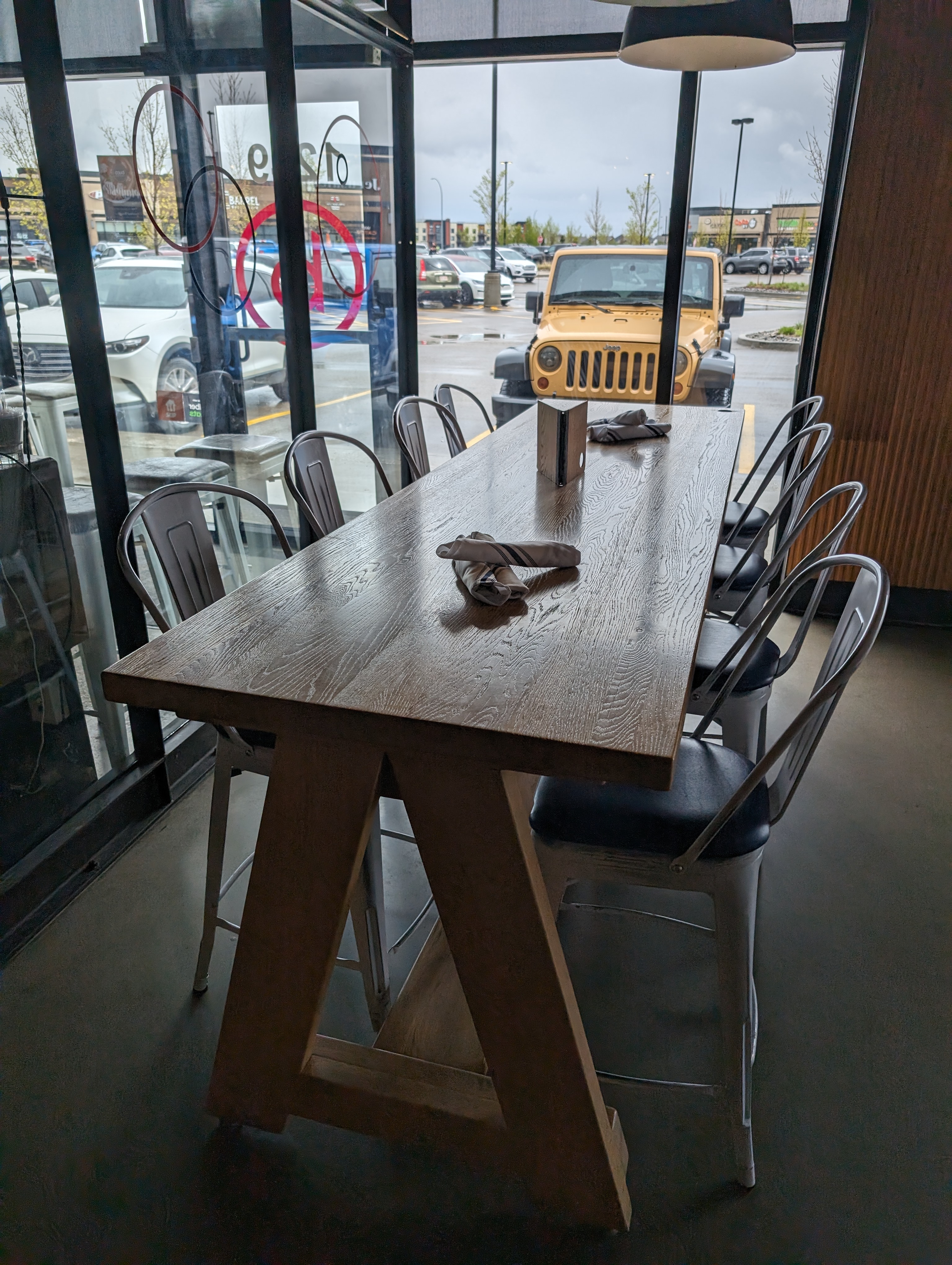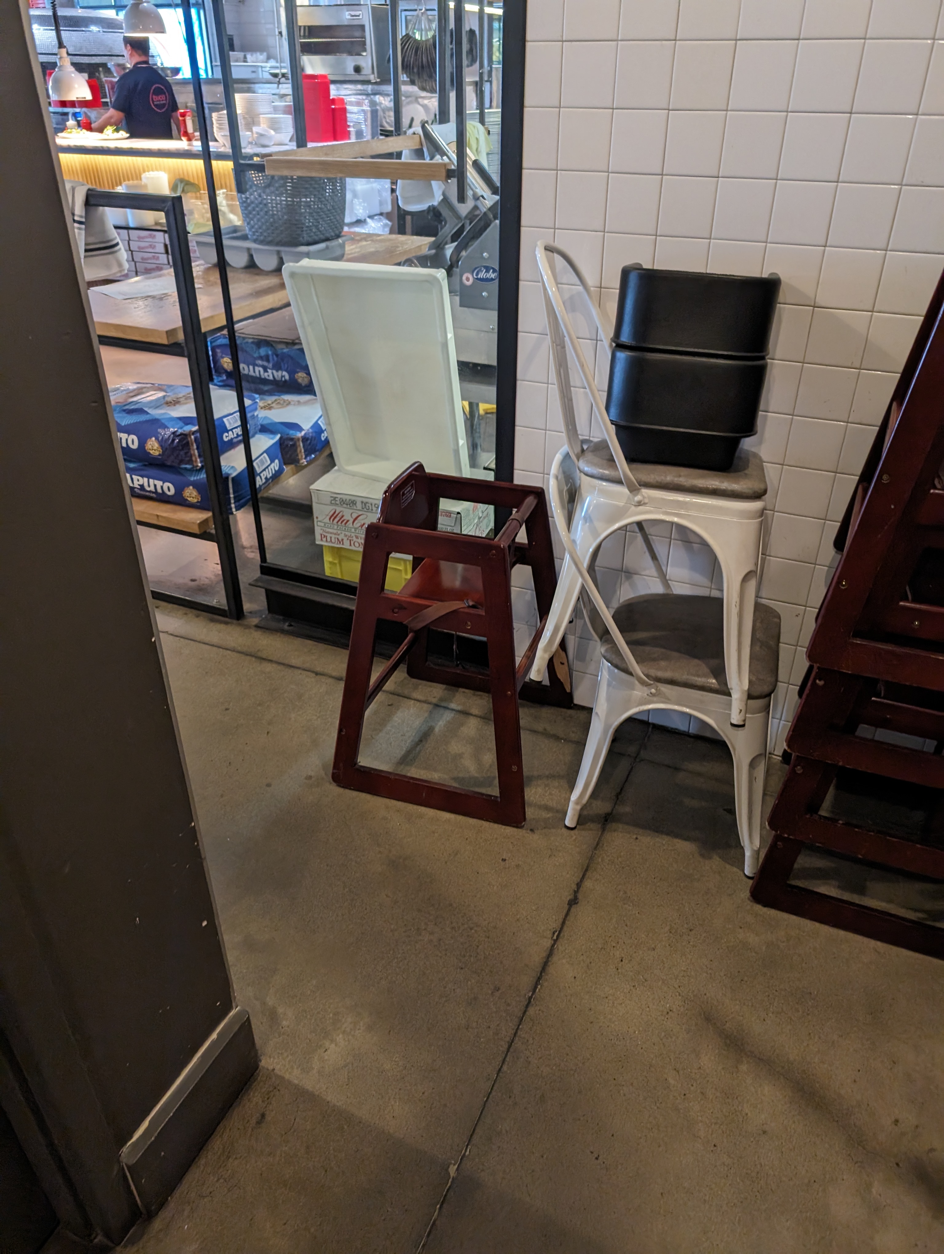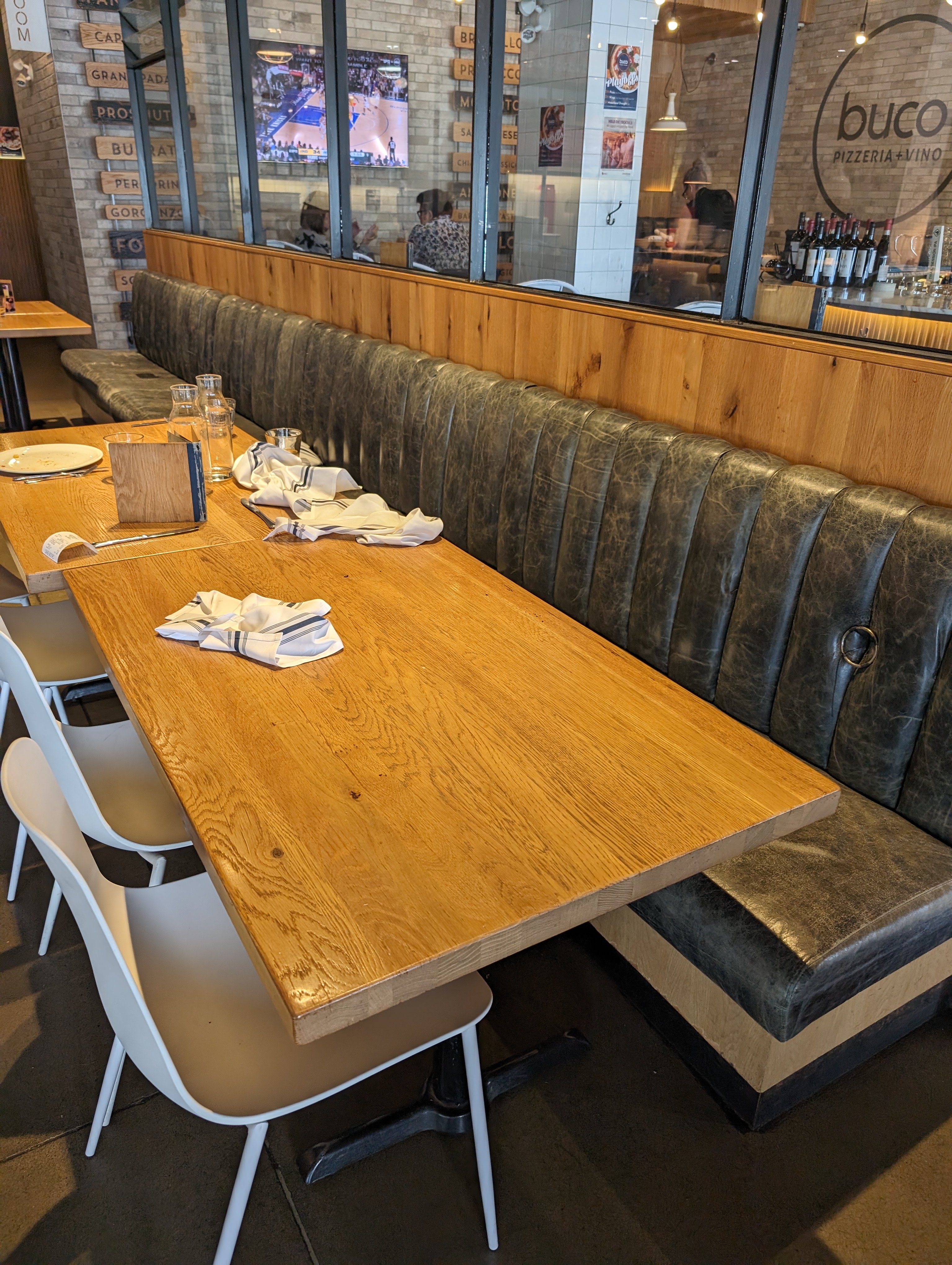 - Varied seating, including raised/bar-level chairs and booth, and floor-level chairs and booths