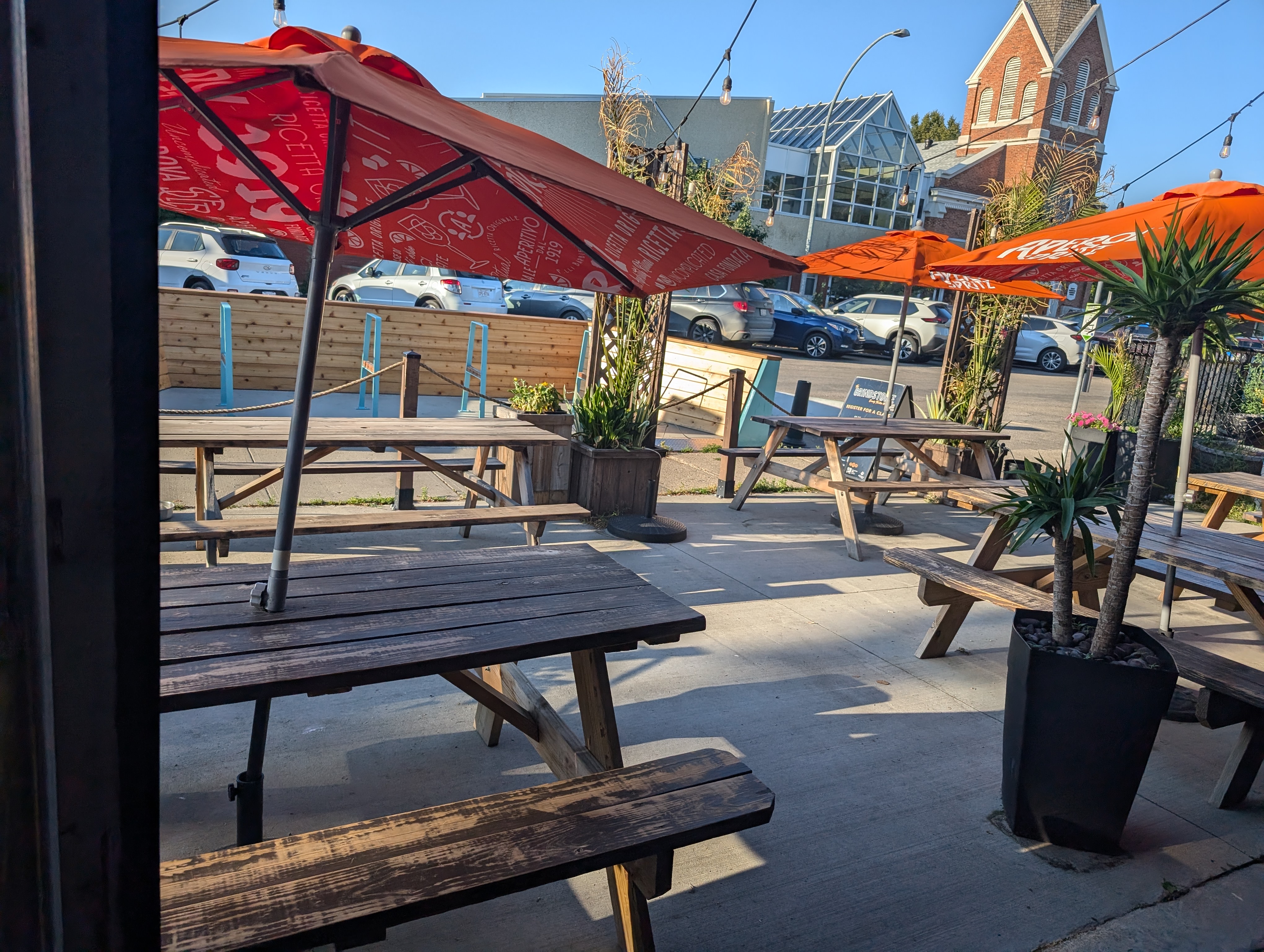 - Picnic benches are attached to table with bars (must be stepped over to get onto bench)
