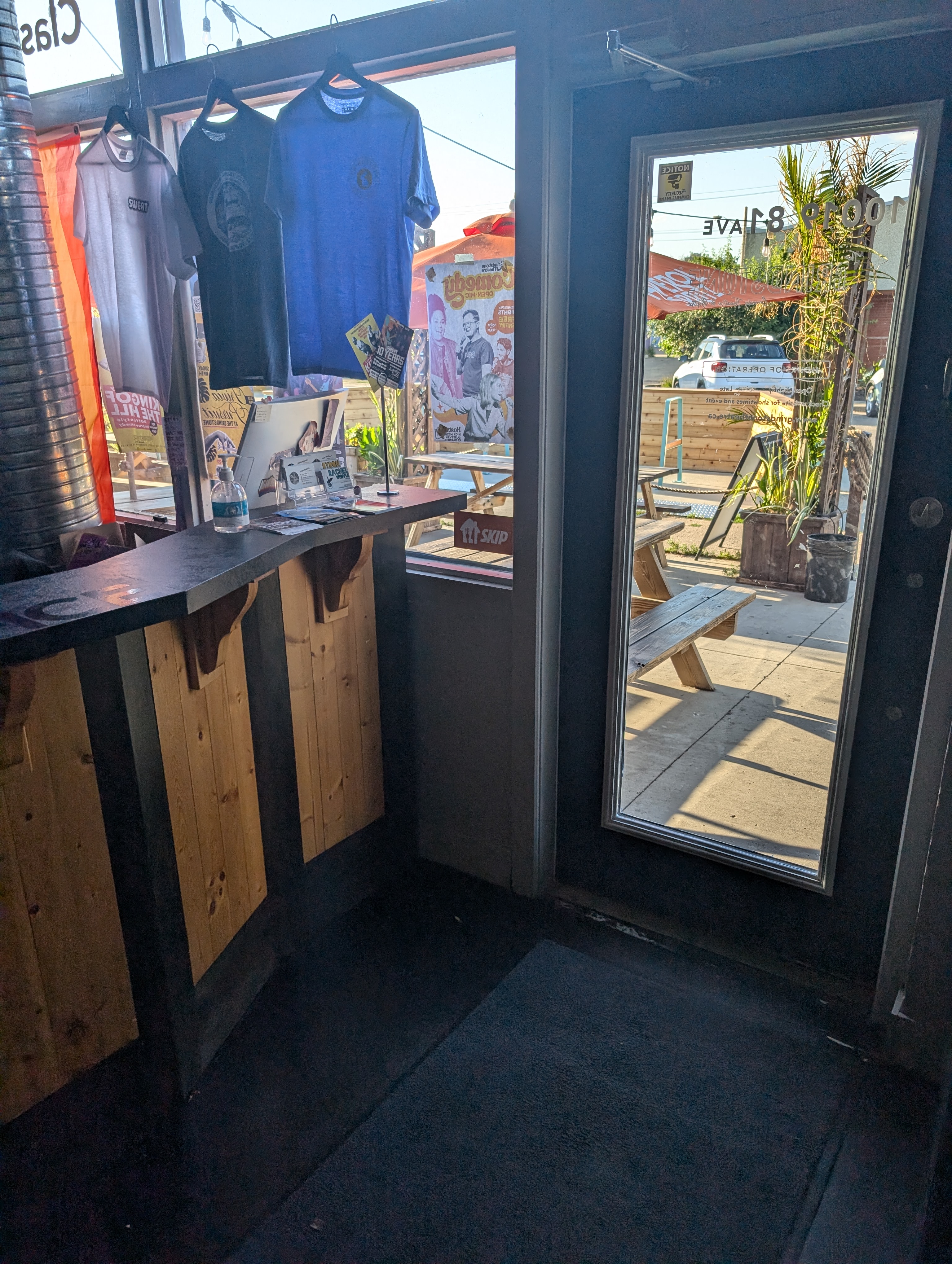 - Bathroom has no main door (open doorway), and stalls have privacy doors (top-to-bottom doors that are light to push open)