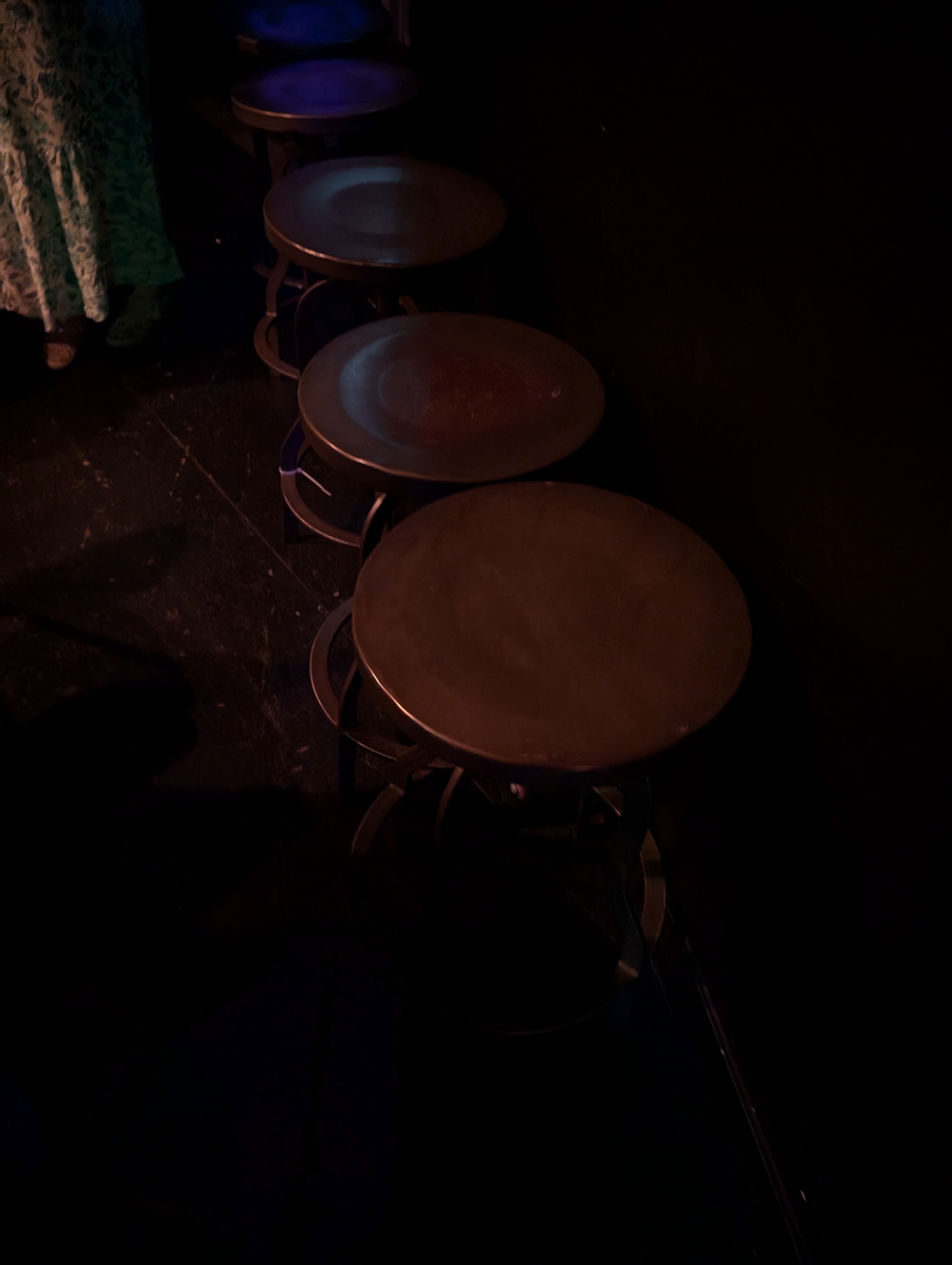 - 4-5 circular stools along one wall as extra seating are 14″x14″