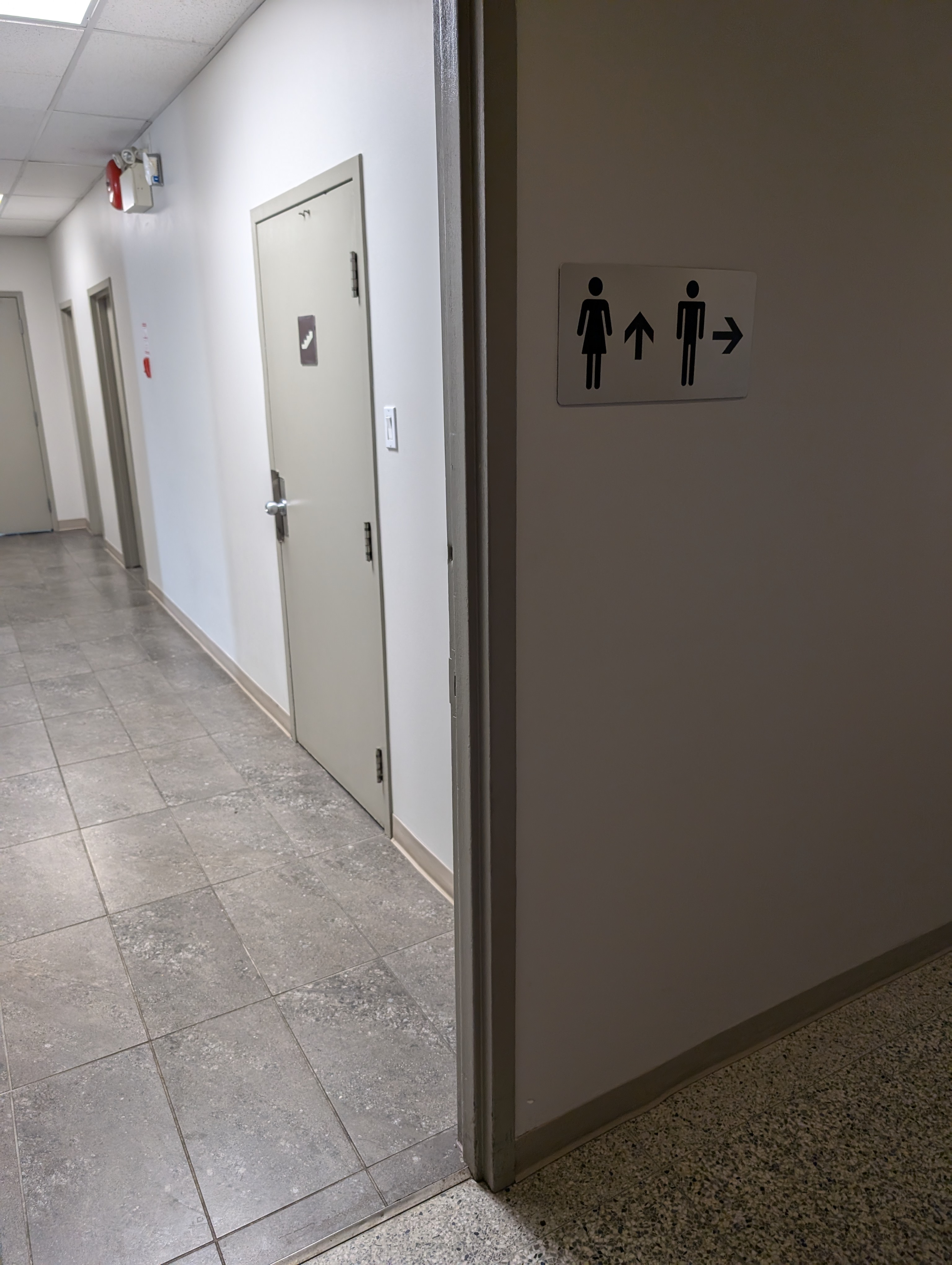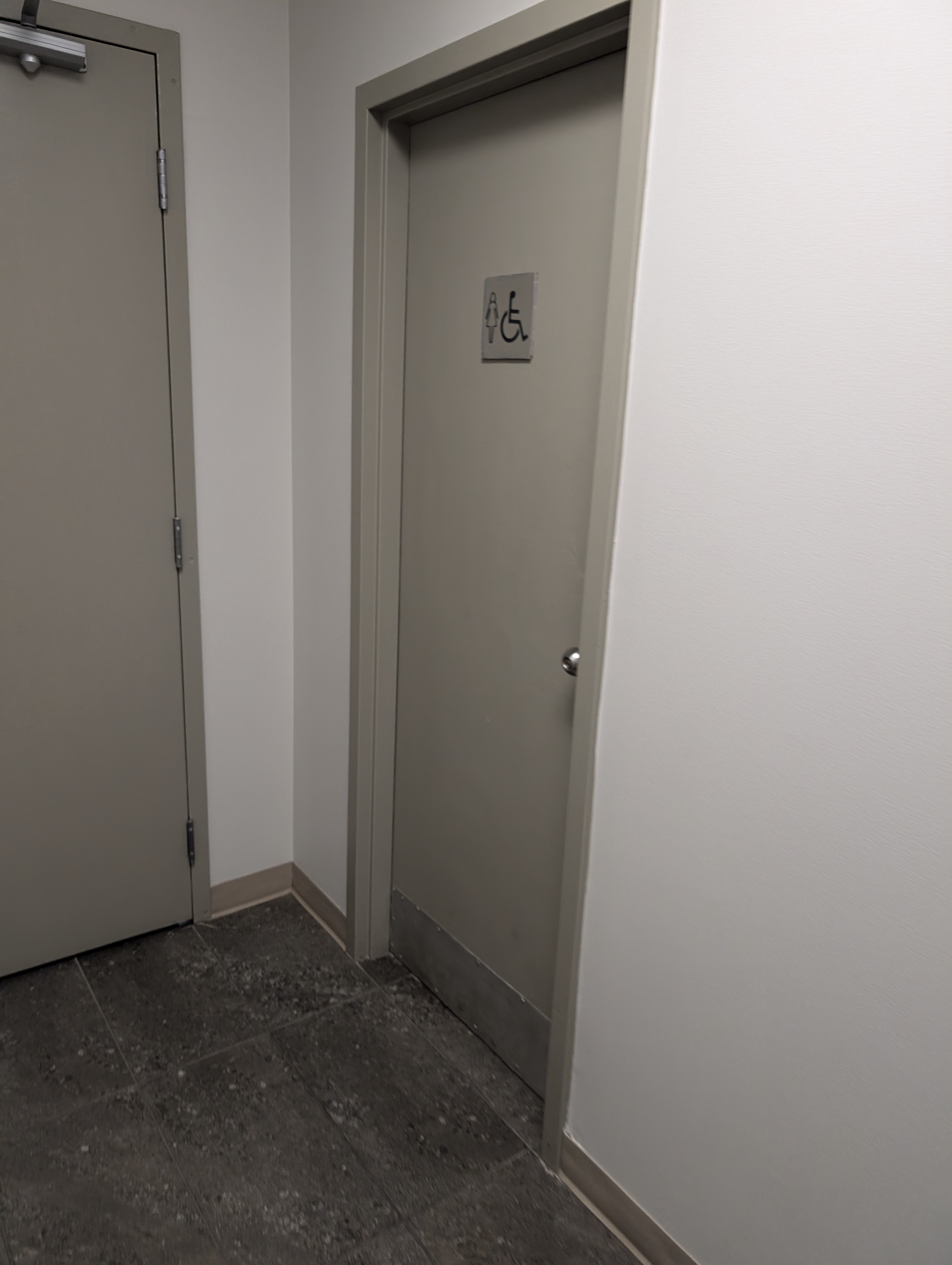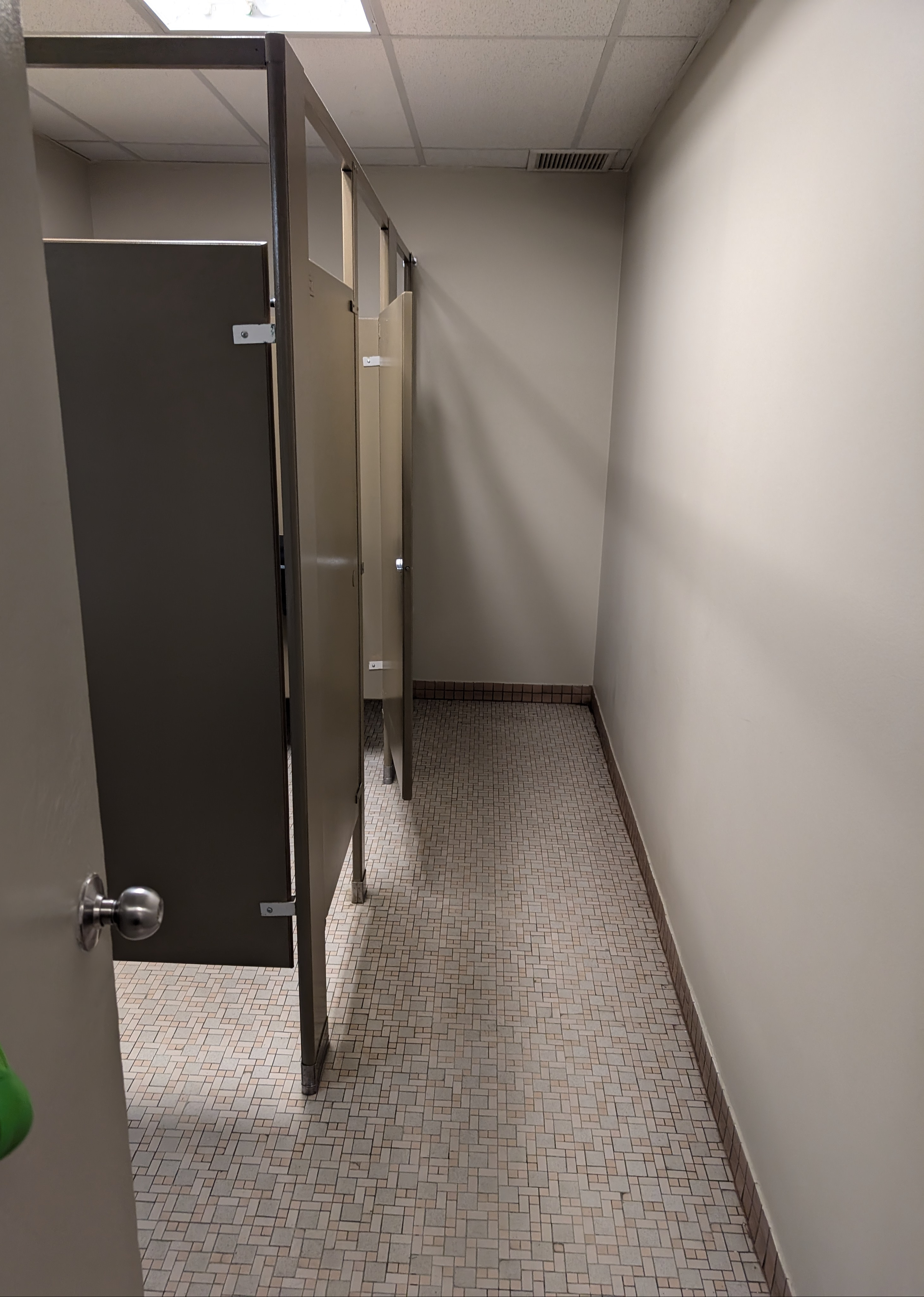 - Two gendered bathrooms, both have two stalls, one of which is accessible