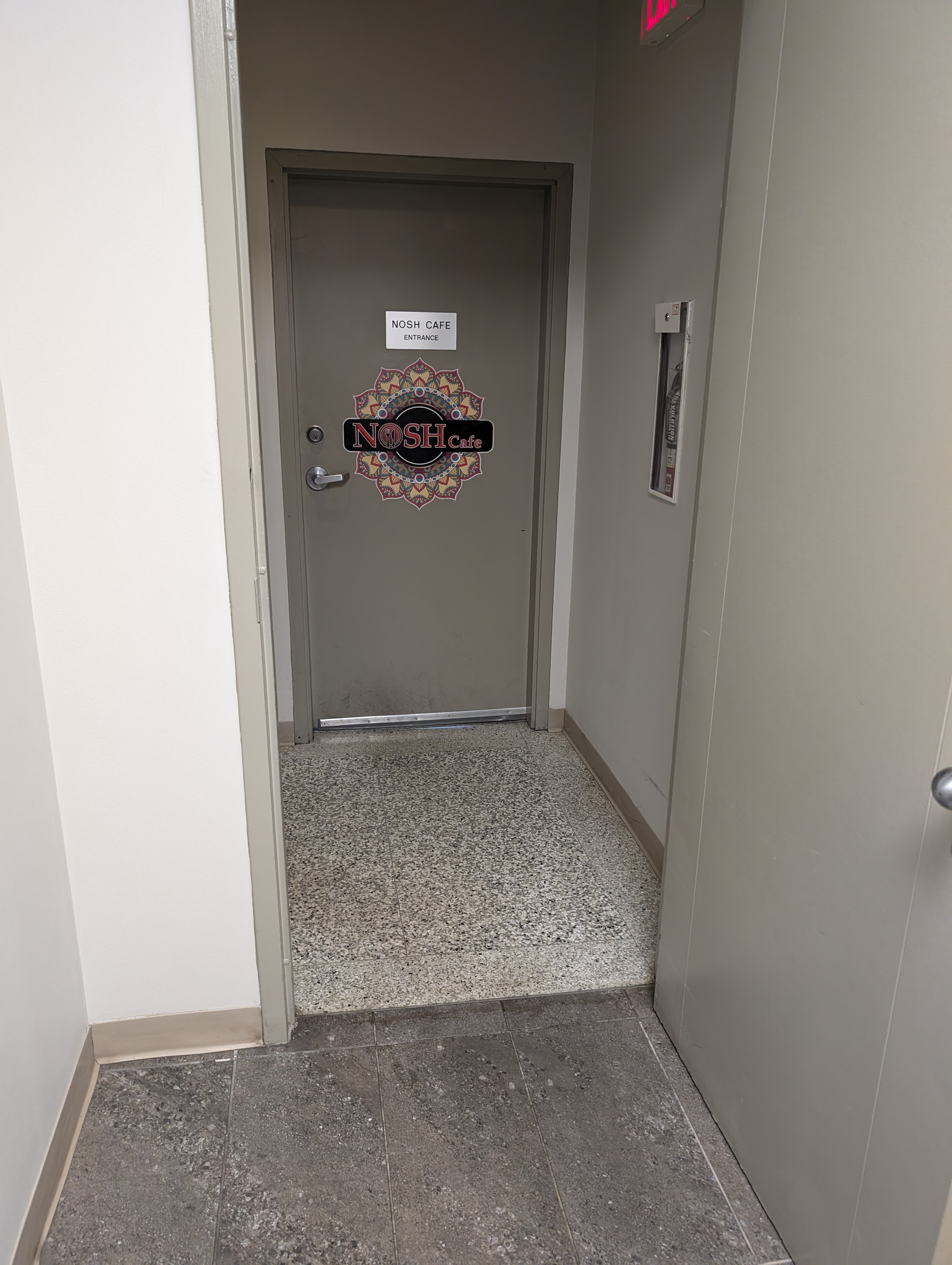 - Shared bathroom use with the rest of the building, so the bathrooms require a key and are through a door and hallway in the back wall of the restaurant. No stairs or blockages