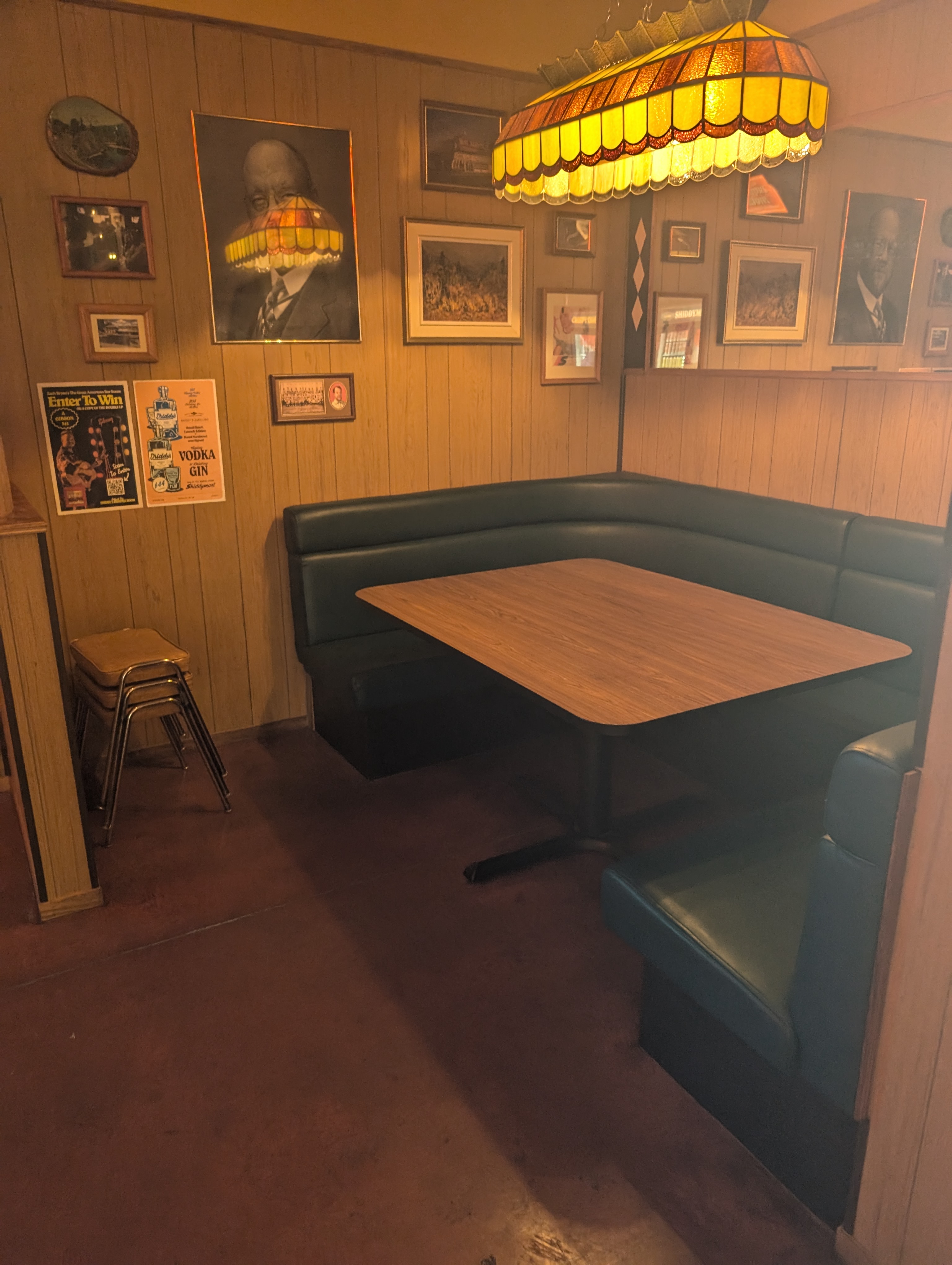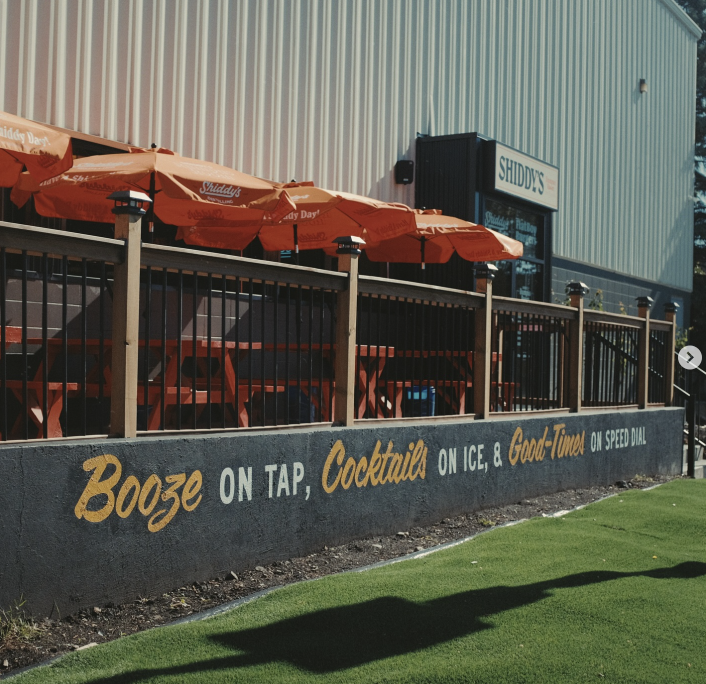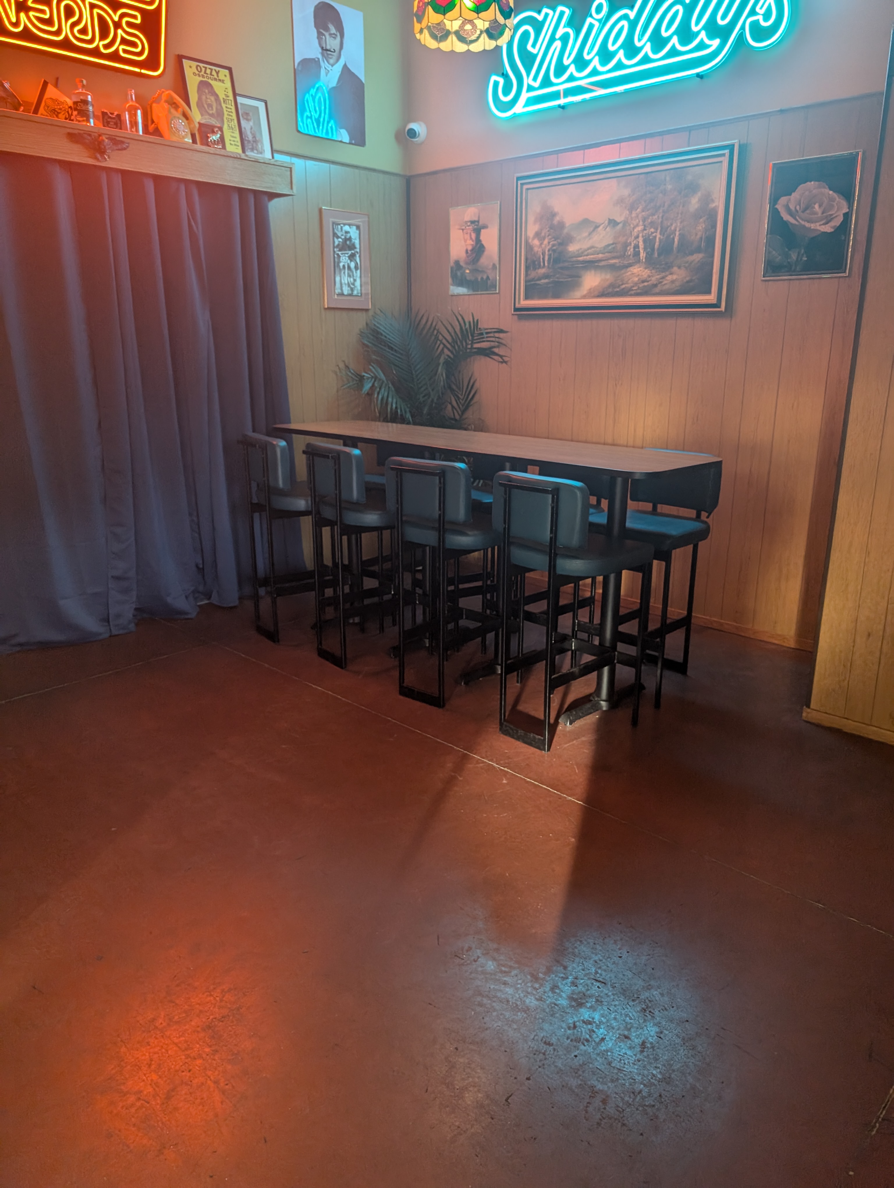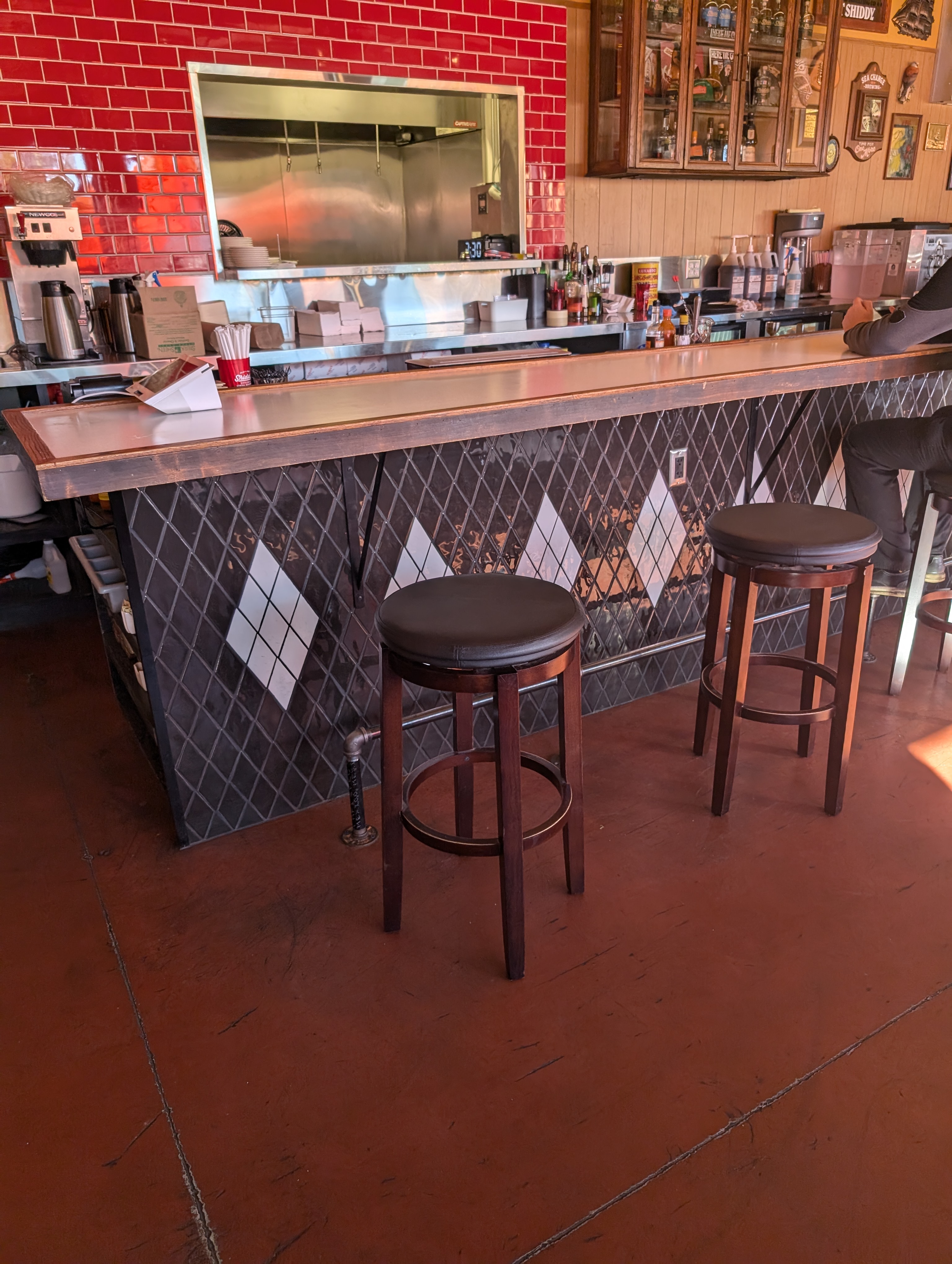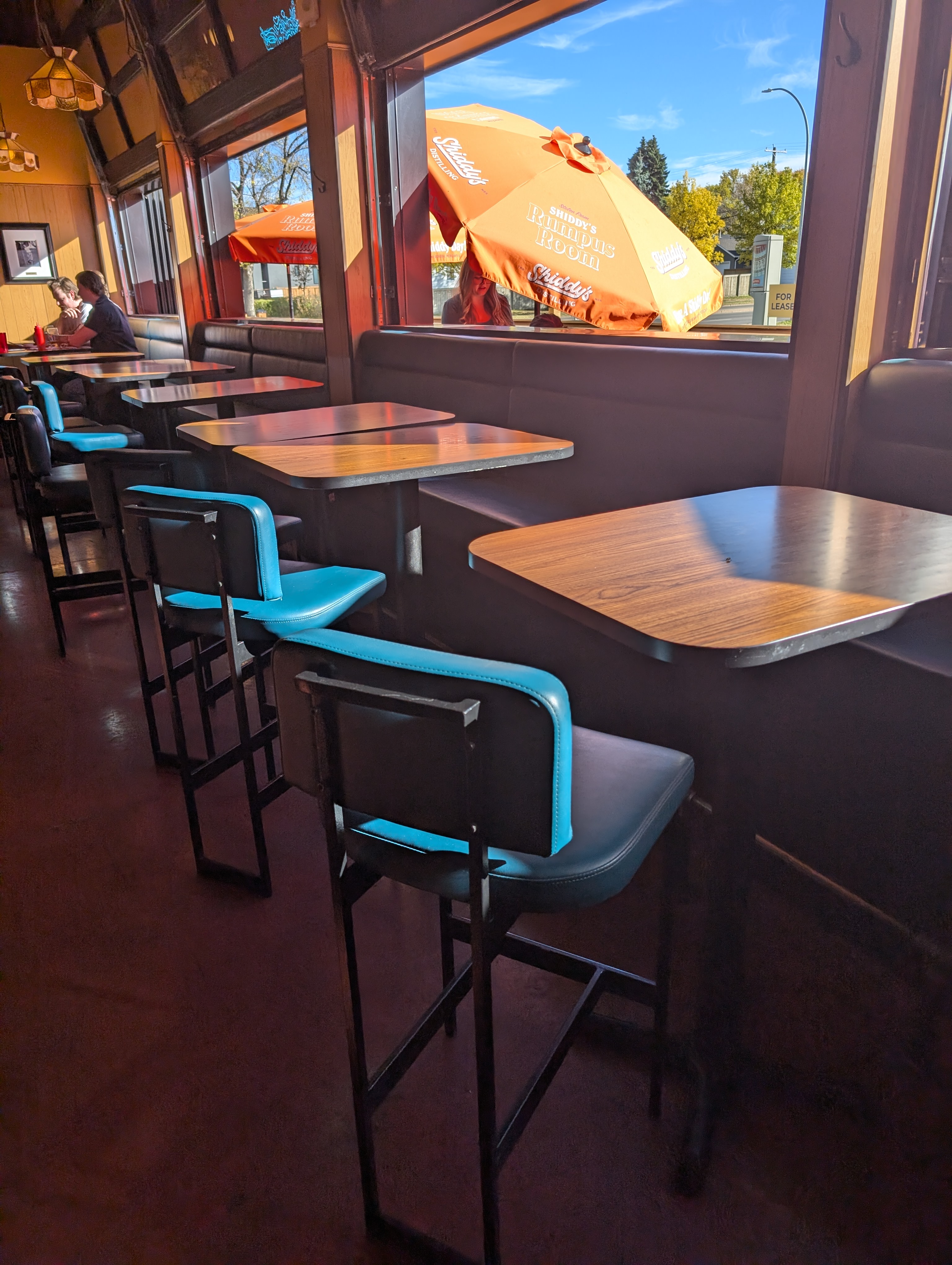 - Outdoor seating includes bar stools and two different types of picnic benches (non-mobile benches)