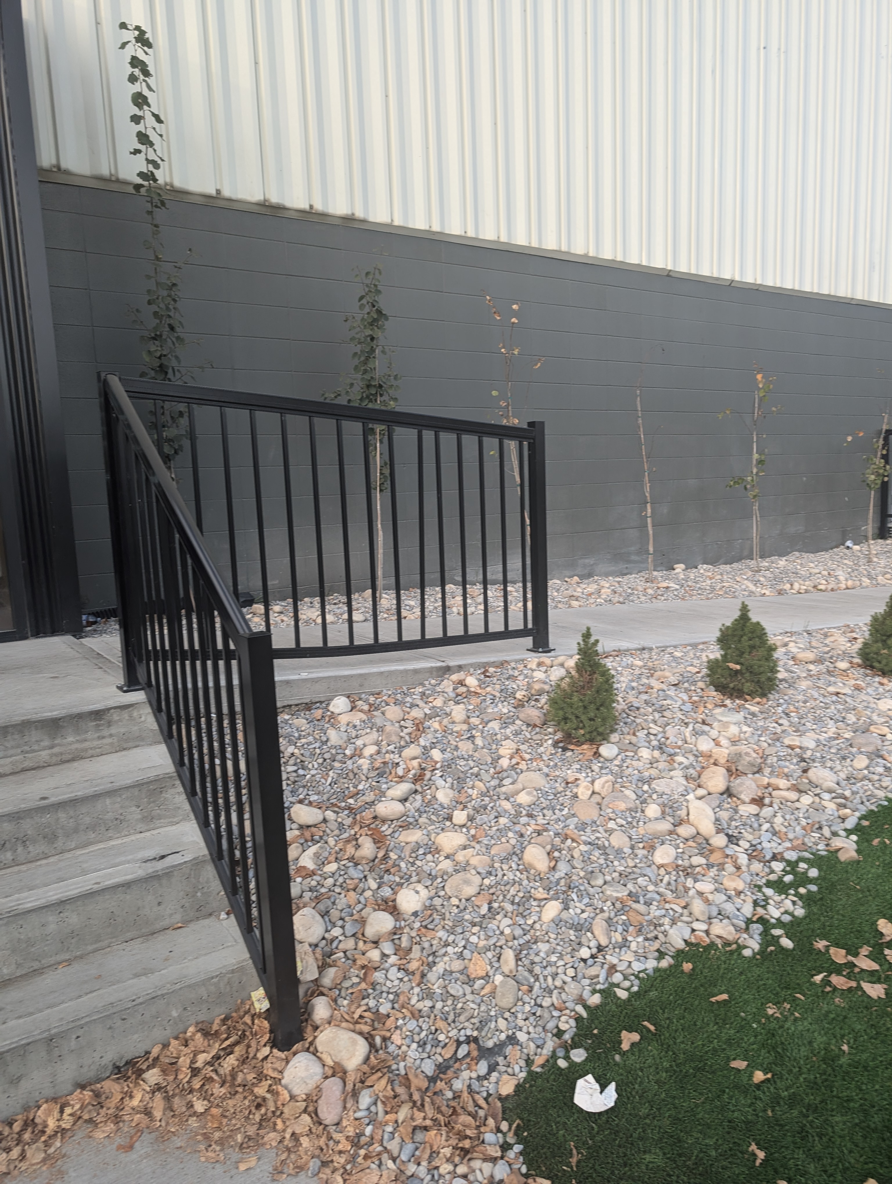 - Main entrance is a single manual door (medium heavy) accessible by four shallow concrete steps, or a ramp to the right of stairs